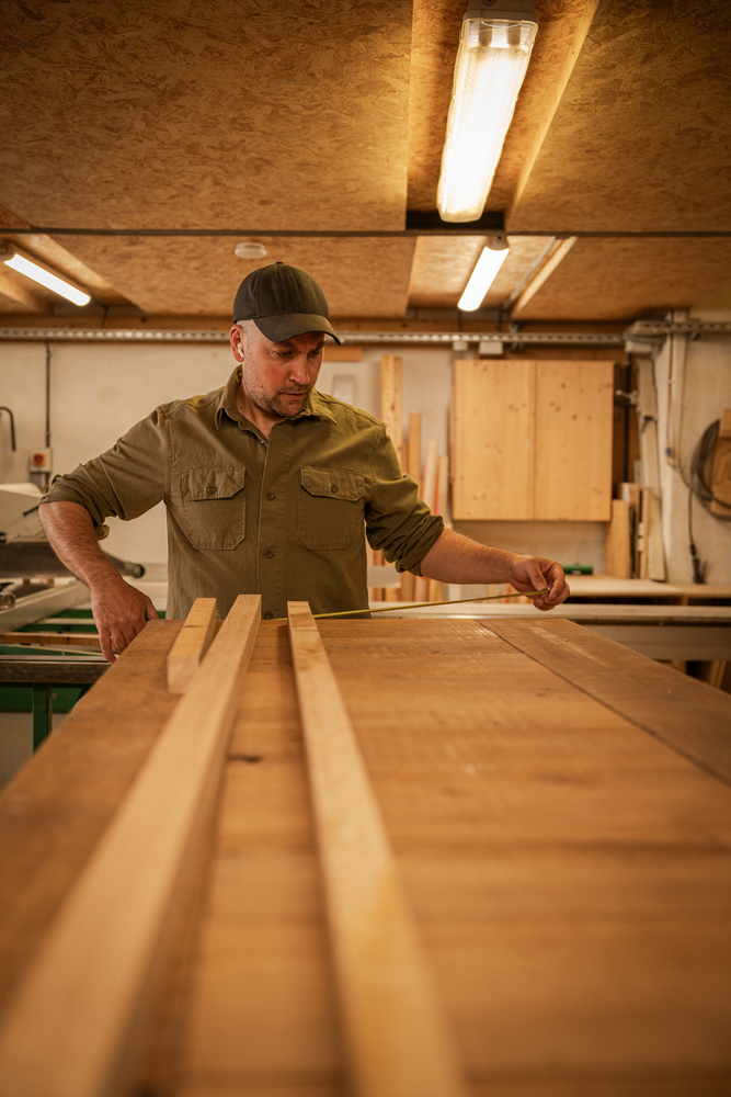 Thomas inscrit sa pratique dans une démarche consciente et responsable : il privilégie le réemploi au matériau neuf, la rénovation et revalorisation de l’ancien, les essences de bois local et traçable et le vélo cargo au camion !